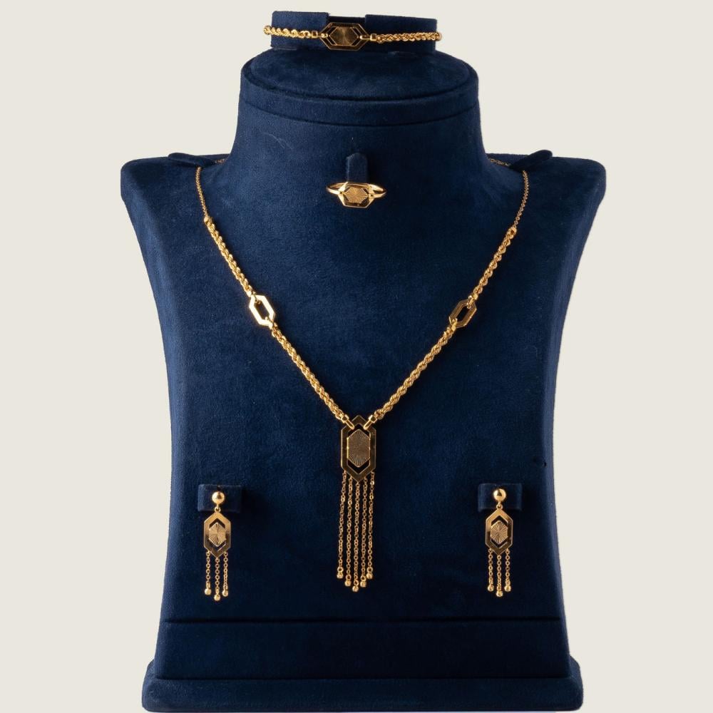 - التكوين: طقم متكامل يضم العقد اللاريات، سوار، أقراط متدلية، وخاتم بتصميم الحلقات المتشابكة.